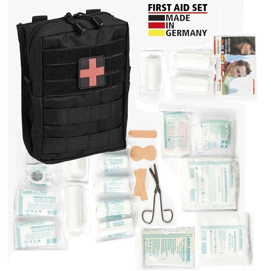 A német Mil-Tec Leina elsősegély készlete egy gondosan összeállított, 43 darabból álló szett, amelyet a német Leina-Werke orvostechnikai szakvállalat minőségi komponenseiből állítottak össze. A készletet úgy tervezték, hogy kompakt mérete ellenére a kisebb horzsolásoktól kezdve a komolyabb vágott sebek ellátásáig mindenhez tartalmazzon steril eszközöket. A praktikus, cipzáras hordtok hátoldalán található MOLLE rögzítőfülek segítségével a szett könnyen övre fűzhető vagy hátizsákra rögzíthető, így túrázás, vadászat vagy taktikai gyakorlatok során is mindig kéznél van.